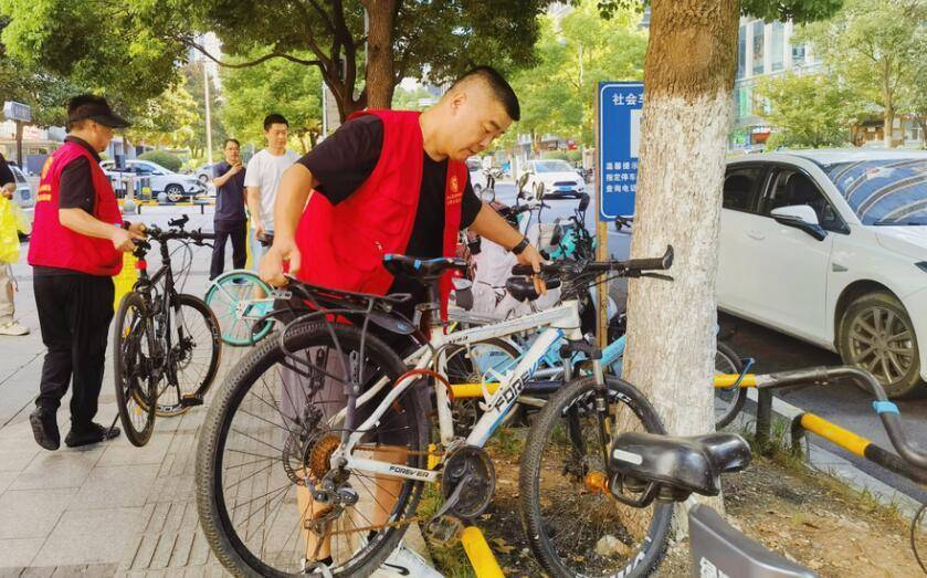 志愿者们规整路边乱停放的非机动车辆。
